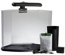GloFish 5 Gallon Cresent Aquarium KitThe GloFish 5 Gallon Cresent Aquarium Kit has a curved front side with a seamless view and a convenient feeding hole on the canopy. The LED light is detachable and has an on and off switch. This aquarium kit also features a black base, a Tetra Whisper internal filter, and a Bio-Bag cartridge. Remember to use a heater for tropical fish.