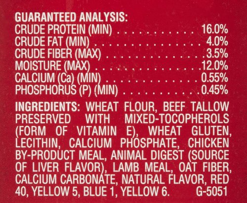 Wheat flour, beef tallow preserved with mixed-tocopherols (form of Vitamin E), wheat gluten, lecithin, calcium phosphate, chicken by-product meal, animal digest (source of liver flavor), lamb meal, oat fiber, calcium carbonate, natural flavor, Red 40, Yellow 5, Blue 1, Yellow 6. G-5051