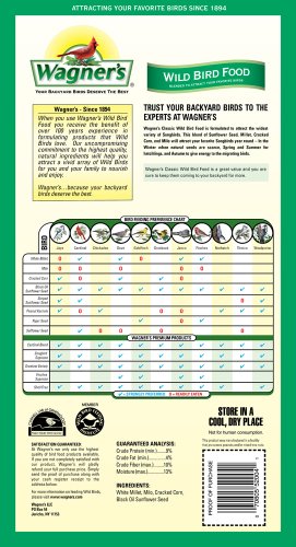 Wagner's Classic Wild Bird Food is blended for year round feeding and is formulated to attract a wide variety of birds. This blend of sunflower seed, millet, cracked corn, and milo will attract your favorite birds year round – in the winter when natural seeds are scarce, spring and summer for hatchlings, and autumn to give energy to the migrating birds. Wagner’s Classic Wild Bird Food is a great value and you are sure to keep them coming to your backyard for more. Trust your backyard birds to the experts at Wagner’s.