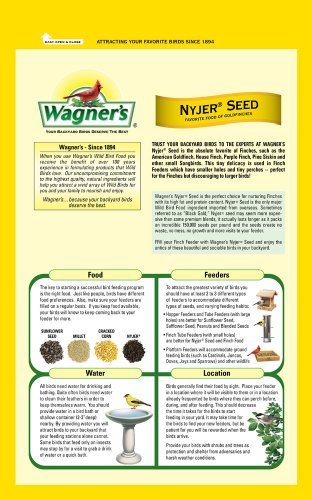 Wagner's Nyjer Seed is the absolute favorite of Finches, such as the American Goldfinch, House Finch, Purple Finch, Pine Siskin and other small songbirds. This tiny delicacy is used in finch feeders which have smaller holes and tiny perches – perfect for the Finches but discouraging to larger birds. Wagner’s Nyjer Seed is the perfect choice for nurturing Finches with its high fat and protein content. Sometimes referred to as “black gold,” nyjer seed may seem more expensive than some premium blends, it actually lasts longer as it packs an incredible 150,000 seeds per pound and the seeds create no waste, no mess, no growth and more visits to your feeder. Fill your Finch feeder with Wagner’s Nyjer Seed and enjoy the antics of these beautiful and sociable birds in your backyard. Trust your backyard birds to the experts at Wagner’s.