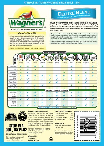 Wagner’s Deluxe Wild Bird Food Blend with 20% sunflower and general purpose seeds offers the backyard enthusiast a value plus moderately priced food that is the real deal! Deluxe Blend can be used in all types of feeders as well as being a great mix to attract those wonderful ground feeding birds. You’ll get all the regular customers like Cardinals, Chickadees and Finches as well as other indigenous backyard visitors. Trust your backyard birds to the experts at Wagner’s.