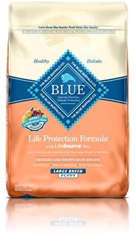 Puppies love our tasty chicken, and it provides them with essential amino acids they need every day. Wholesome Whole Grains: Hearty whole grains like brown rice, barley and oats supply the complex carbohydrates that your large breed puppy needs for energy. Healthy Garden Veggies: Whole carrots, sweet potatoes and garlic are three of the nutrient-rich vegetables that your large breed puppy will get in every bite of BLUE.
