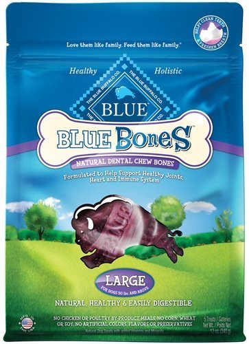 BLUE Bones are tasty and highly digestible dental chews that will help to freshen your dogs breath and make his teeth sparkle Plus BLUE Bones are the only dental chew bones with our unique blend of natural ingredients that help promote specific health benefits. Type – Dog. Flavor – Dog Bone. Size – Large. zIngredients. Deboned Salmon Whole Ground Brown Rice Oatmeal Maple Syrup Vegetable Glycerine Whole Ground Potato Gelatin Carrots Sweet Potatoes Salt Flaxseed source of Omega 3 and 6 Fatty Acids Blueberries Phosphoric Acid an acidifier Natural Smoke Flavor Sorbic Acid Vitamin A Calcium Ascorbate source of Vitamin C Vitamin E Supplement Taurine Glucosamine Hydrochloride Chondroitin Sulfate Citric Acid Mixed Tocopherols source of Vitamin E Rosemary