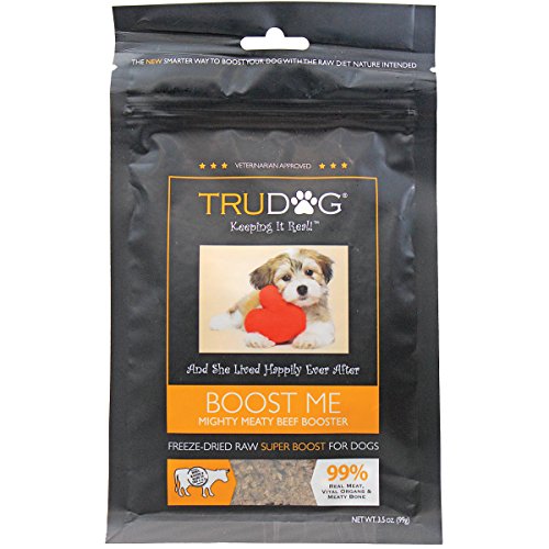 ENHANCE YOUR DOG'S FOOD WITH REAL MEAT BOOSTER: Boost Me-Might Meaty Beef real meat meal booster is Freeze Dried, and does not require refrigeration. Boost Me Real Meat Meal Booster is indented to enhance the nutritional value of your current dry or wet food or can be served as a complete meal. An excellent choice for ill or older dogs, finicky eaters or a great way to transition to freeze dried raw food. TRUDOG'” is so easy to feed, just add water to unlock the aroma and real meat flavor. IT'S THE BEST THING SINCE SLICED BREAD: You know what we mean, it's that product that no matter where you dog is in the house, he comes running as soon as he hears that bag open TruDog Boost Me is a versatile food based supplement that contains nothing but Wisconsin Free Range Beef and Vital Beef Organs. A true superfood that can be fed in so many different ways you'll always have to keep a bag on hand, we do for our own pets and everyone at TruDog swears by Boost Me as the ultimate doggie motivator!