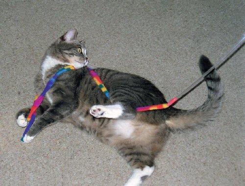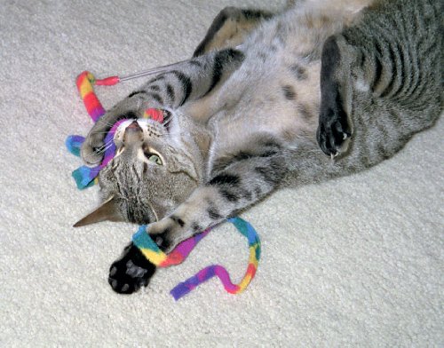 Cat Charmer is an interactive cat toy designed to charm and not harm. With a polycarbonate wand and very colorful fabric, Cat Charmer provides excellent aerobic excercize and is a safe interactive toy for all kittens, cats, and kids. Now with bright new candy colored wands and a fun selection of colors.