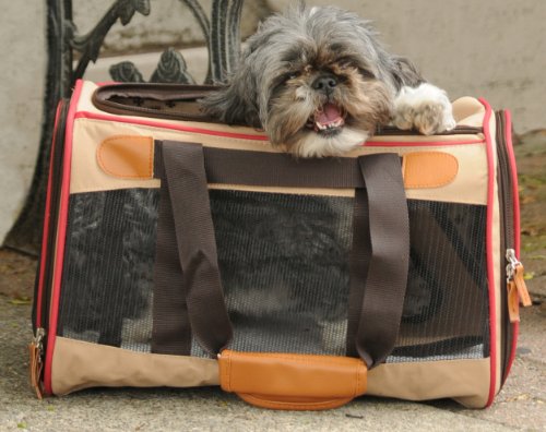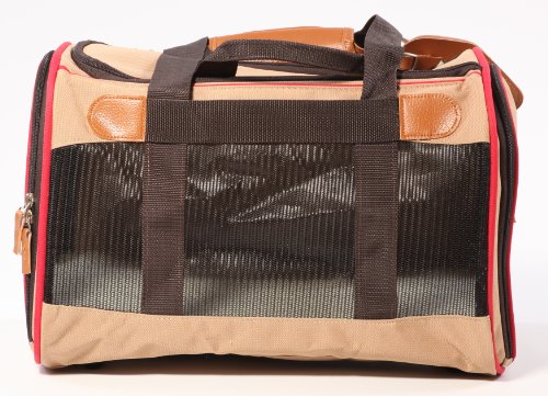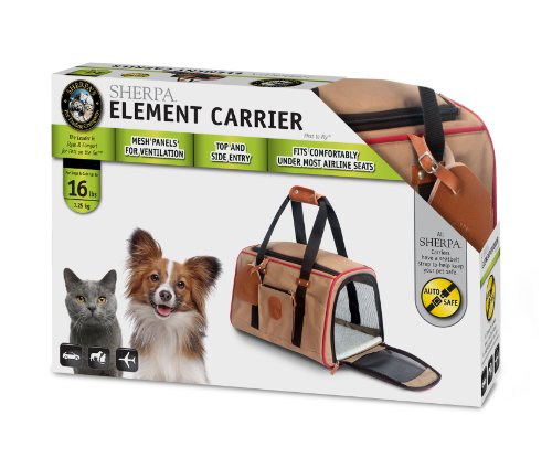 The Element Carrier is a lightweight, comfortable carrier that allows for easy transportation of your pet. This classically designed carrier features top and side entry, a side pocket for storage, mesh panels for ventilation, locking zippers, padded hand carry straps, a seatbelt/luggage strap and a luggage tag. The Element Carrier is approved for use on most major airlines and intended for dogs and cats up to 16 pounds. It is 18 Inch long, 11.25 Inch high and 11.25 Inch wide. The faux lambskin liner is machine washable and the carrier is to be spot cleaned only. All Sherpa carriers are protected by a one year limited warranty against manufacturer defects.