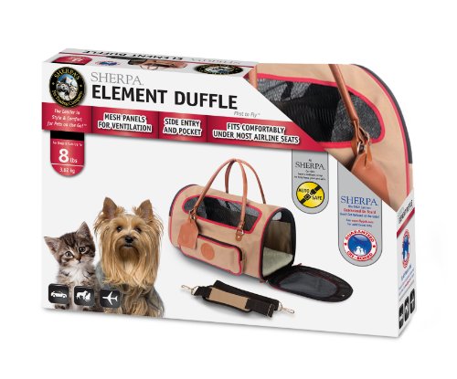 The Element Duffle is a lightweight, comfortable carrier that allows for easy transportation of your pet. This classically designed carrier features side entry, rear and side pockets for storage, mesh panels for ventilation, locking zippers, hand-carry straps, an adjustable, padded shoulder strap, a seatbelt / luggage strap and a luggage tag. Approved for use on most major airlines and included in Sherpa's Guaranteed On Board program. This carrier is intended for dogs and cats up to 8 pounds and is 14 inches long, 9 inches high and 9.5 inches wide. The faux lambskin liner is machine washable and the carrier is to be spot cleaned only. All Sherpa carriers are protected by a one year limited warranty against manufacturer defects.