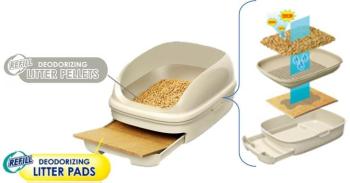 The upper level holds Purr Fect Potty Litter Pellets, made of conifer wood trimmings. The litter box‘s lower level contains a tray that holds a Purr Fect Potty Pad. Urine flows through the Pellets to the lower level, so there’s no clumping or daily cleaning. With normal daily removal of solid waste (feces), the system of Pads and Pellets controls odor for an entire week.