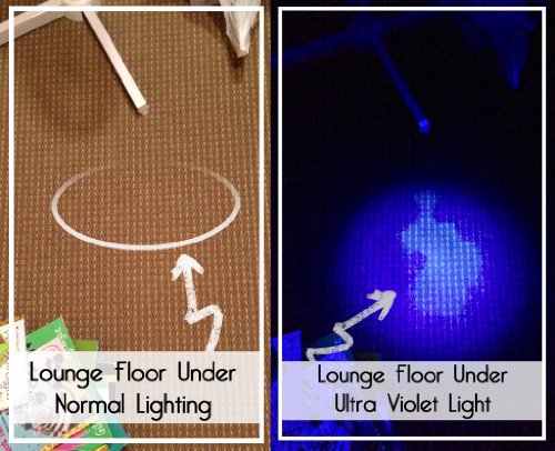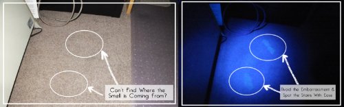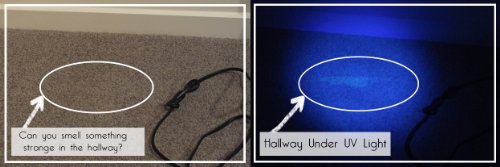 It works by causing the salts that are present in dried urine to fluoresce like a yellow neon sign, making them easily visible to the human eye, and a breeze to spot clean, saving you hundreds of dollars in expensive cleaners, or the need to replace the entire carpet. Check it out for yourself, view the photo's at the top of this page to see the 'findings'.