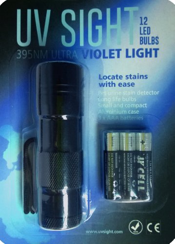 UV Sight's #1 Ultraviolet Blacklight Stain & Urine Detector Torch is the Best Handheld Ultra Violet Flashlight to Find Stains. Our Incredibly Bright 12 LED Portable Black Light Flash Lights are Ideal to Find Cat, Dog or Rodent Urine Smells That You Otherwise Can't See on Carpet, Rugs or Furniture Material. 3 x AAA Batteries Included – 90 Day Guarantee