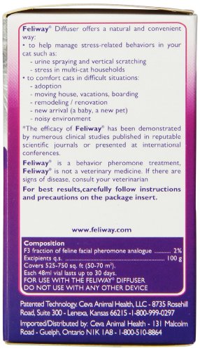 Stock up on refills for your Feliway Plug-In Diffuser (sold separately), and maintain a state of security and familiarity to help your cat cope with a new environment. Just plug the Feliway Diffuser into any electrical socket. Much like a plug-in deodorizer, the Feliway Diffuser emits a synthetic cop of your cat’s natural facial pheromone, used by felines to mark their territory as someplace safe and secure. Oil vapor carrying the pheromone will rise in a column of warm air above the Diffuser and prevent your kitty from urinating to mark its territory. Using pheromonatherapy to help sooth your pet is a new field in veterinary medicine. This scent in a room will help reassure your cat while it copes with a challenging new situation. If the Diffuser is being used to help reduce or prevent another behavioral or medical problem, plug it in the room where your cat spends most of its time. Do not cover it, or place it behind a door or beneath furniture. Will cover an area of 50 to 70 square meters and last up to 4 weeks.