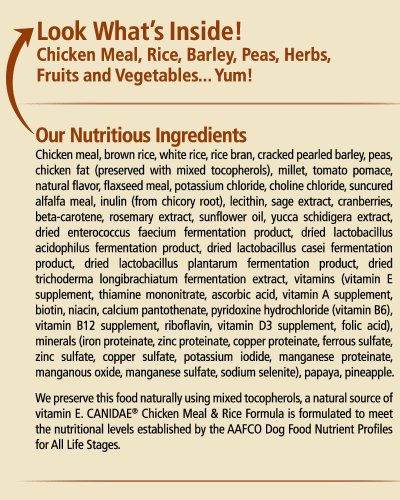 Our CANIDAE Life Stages Chicken Meal and Rice Formula is packed with protein from high quality, natural chicken meal. Our other healthy ingredients include wholesome brown rice, peas, papaya, and sage to provide your dog with a great tasting, perfectly balanced meal. We never use ingredients like wheat, corn or soy. You won’t find fillers, antibiotics, hormones, preservatives, artificial flavors, artificial colors, or artificial anything in any of our foods. All of our pet food formulas are made in the U. S.A.
