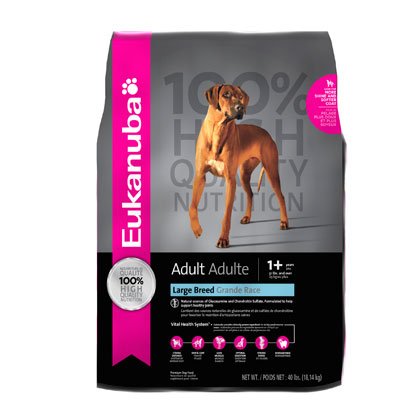 Eukanuba Large Breed Adult Dog Food — Eukanuba Dog Food and Large Breed Dog Food Is Eukanuba Large Breed Adult Dog Food addresses the special needs of large and giant breed adult dogs that have bodies that are just as big as their appetites. Containing natural sources of glucosamine and chondroitin sulfate for supporting joints stressed by a large breed dog's greater weight. Eukanuba large breed dog food for adult dogs also aids in digestion by containing appropriate levels of a natural vegetable fiber. Moreover, this large-breed Eukanuba dog food formula aids adult dogs in having an appropriate stool volume for easier clean up. In addition, this unique large breed dog food formula for adult dogs has been specifically designed for a large breed dog's mouth by being made in large-sized kibble.Eukanuba Large Breed Adult Dog Food Contains Our Highest Quality Ingredients. Clinically proven ingredients in six key performance areas:DentaDefense – 3D DentaDefense is proven to reduce tartar build-up in 28 days.Optimal Digestion – Fiber from a blend of natural beet pulp and prebiotic FOS promotes nutrient absorption and digestive health.Immune Health – Antioxidants help promote your dog's immune system and keep it strong.Strong Lean Muscles – High quality animal based proteins help build strong, lean muscles to target optimal body condition.Strong Bones – Contains calcium to promote strong bones.Optimal Weight – Excellent nutritional balance of fats, carbohydrates, vitamins & minerals and proteinSkin & Coat – Contains OmegaCoat, guaranteed optimal levels of Omega 6 and 3 fatty acids promote healthy skin and radiant coat.