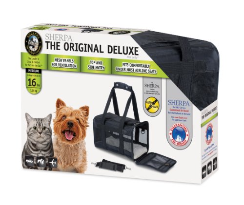The Sherpa Original Deluxe Pet Carrier is stylish, lightweight, and conforms with commercial airline carry-on specifications. It features a durable quilted nylon construction, mesh panels for ventilation, and two convenient entries: front and top. Its seat belt safety strap fits conveniently over upright luggage handles. The faux lambskin liner is machine washable and the carrier is to be spot cleaned only. All Sherpa carriers are protected by a one-year limited warranty against manufacturer defects.