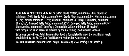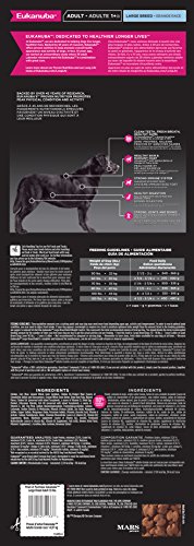 Large and giant breed dogs have special nutritional needs — not just for their size, but also for their appetites. EUKANUBA Adult Large Breed Dog Food, made with real chicken as the first ingredient, is formulated with natural sources of glucosamine and chondroitin sulfate to help support joint health. Our dry dog food also features a larger kibble size that's designed for your large dog's mouth and helps to reduce tartar build-up. Best of all, EUKANUBA Large Breed Dog Food is made with no artificial preservatives, flavors or colors, so you can feel confident that your large dog is getting only premium ingredients in every bite. When it comes to premium performance dog food and nutrition for adult dogs, EUKANUBA Dry Dog Food delivers the key ingredients your large breed dog needs to reach their full potential.