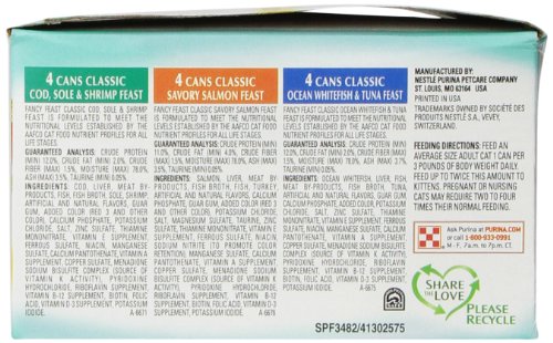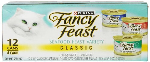 Fancy Feast Gourmet Cat Food contains three flavor variety. It comes in enchanting shapes with a rich, delicious melding of filet mignon and seafood flavors. Savory Salmon, Cod, Sole and Shrimp and Ocean Whitefish