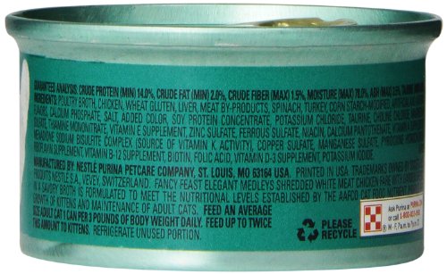 Elegant Medleys from Fancy Feast creates restaurant inspired food for cats so that every member of the family can dine well. Shredded Chicken Fare offers a tempting selection of shredded white meat chicken accented with garden greens, in a savory broth. In addition to including real meat and vegetables, Elegant Medleys is vitamin and mineral fortified to keep your kitty healthy. Simple to serve, right out of the can, Elegant Medleys provides adult cats and kittens with the experience of a well balanced meal and a delectable taste your cat will love.Feeding Recommendations: Feed an average size adult cat 1 can per 2-1/2 pounds of body weight daily. Feed up to twice this amount to kittens.