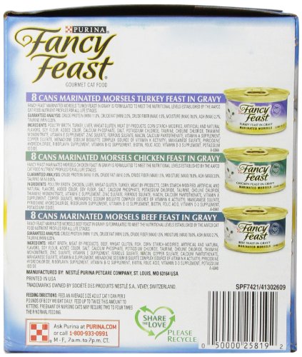 • Variety pack contains 8 cans each of: Chicken, Beef & Turkey Marinated Morsels in Gravy