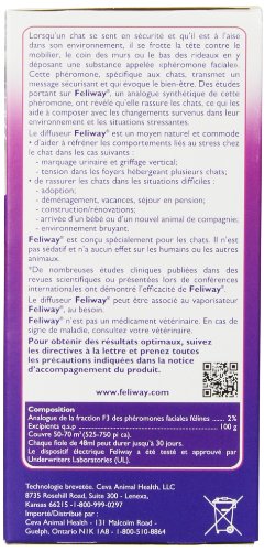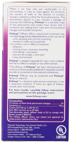 Create a state of security and familiarity to help your cat cope with a new environment. Just plug the Feliway Diffuser into any electrical socket. Much like a plug-in deodorizer, the Feliway Diffuser emits a synthetic cop of your cat’s natural facial pheromone, used by felines to mark their territory as someplace safe and secure. Oil vapor carrying the pheromone will rise in a column of warm air above the Diffuser and prevent your kitty from urinating to mark its territory. Using pheromonatherapy to help sooth your pet is a new field in veterinary medicine. This scent in a room will help reassure your cat while it copes with a challenging new situation. If the Diffuser is being used to help reduce or prevent another behavioral or medical problem, plug it in the room where your cat spends most of its time. Do not cover it, or place it behind a door or beneath furniture. Will cover an area of 50 to 70 square meters and last up to 4 weeks. A 48-milliliter bottle is included along with the diffuser.