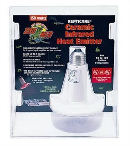 ReptiCare® Ceramic Heat Emitters are the perfect 24 hour heat source for all reptiles. These porcelain heating devices screw into a standard porcelain incandescent socket, giving off intense muscle-penetrating” infrared heat while emitting no light. The flat-faced design is more efficient and longer lasting than conical designs which build up excess heat internally ultimately carbonizing the element.”