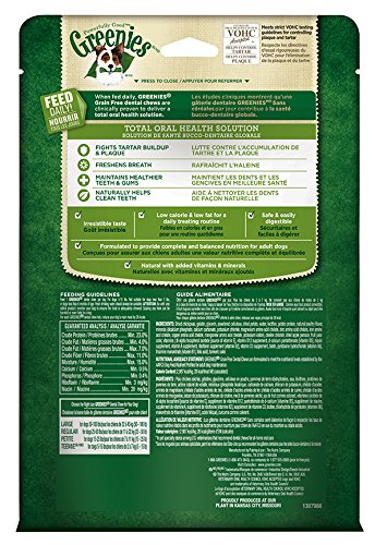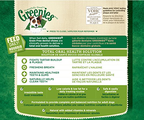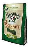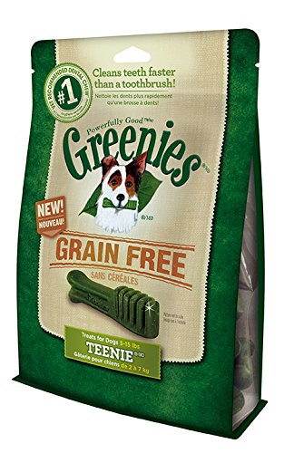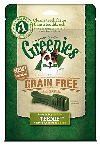 Greenies Grain Free Dental Chew Treats for dogs are safe and easily digestible with an irresistible taste. Its low calorie and fat content makes for a healthy and great daily routine snack. It is formulated with extra vitamins and minerals to provide complete and balanced nutrition for adult dogs. Greenies Grain Free Dental Chew Treat pack Teenier is designed for dogs 5-15 lbs. Greenies is the #1 vet-recommended dog dental chew among veterinarians that recommend dental chews for at-home oral care.