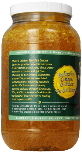 Fluker's cricket quencher provides crickets and other feeder insects with a safe, clean water source as well as offering a good source of calcium for gut loading insects prior to feeding them to your reptile. Comes in 7.5-pounds bottle.