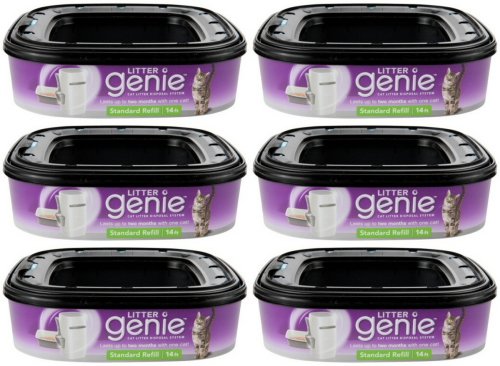 Reload your Litter Genie pail with this specially designed refill that features material to lock away odors. The plastic film pulls down so you can quickly and easily throw away old litter and prepare a new lining and the 14' supply lasts for up to 2 months with a single cat. Designed to fit snugly on the top of your Litter Genie pail, this Litter Genie Cat Litter Disposal System Standard Refill makes it quick and easy to discard your cat's litter and keep odor at bay. When you cut the plastic film to throw the litter away, replacement film pulls down from the convenient design so you're instantly ready for the next time you need it. Works with the Litter Genie cat litter disposal system to conveniently dispose litter clumps and seal away odors Designed to snugly fit the funnel at the top of your Litter Genie pail for easy installation and a tight seal Film pulls down so you can easily prepare the next portion for use Black line at the end of the film lets you know when it's time for a new refill Lasts up to 2 months when used for a single cat Pull the refill's plastic tab and remove the outer rim Pull about 1' of the plastic rim out of the refill, then push down the film through the center of the rim and tie a knot at the bottom Open the lid and funnel and sit the refill on top of the unit; pull the handle and push the rim through the pail Close the funnel and close the lid.