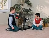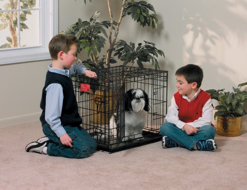 Whether starting with a new puppy or starting again with an adult dog, this folding double-door metal dog crate cuts housebreaking time in half and reduces behavioral problems. The exceptionally versatile unit features a divider panel that allows for adjusting the length of the living area. Keeping the living space small enough reduces the chance of the puppy eliminating in one end and sleeping in the other. Choose the size of crate that the dog will need when it reaches its full adult size, as the divider can be adjusted as the puppy grows. For easy placement in an automobile or in the corner of a room, the dog crate also comes equipped with convenient double doors, which allow both side and front access. Other highlights include safe and secure slide-bolt latches, a durable satin-black electro-coat finish, 1-1/2-by-5-7/8-inch mesh, rounded corners, and two plastic handles for carrying. The unit easily sets up and folds down to a portable size for suitcase-style carrying, and an ABS-composite plastic pan for easy clean up comes included. The dog crate carries a one-year limited warranty.