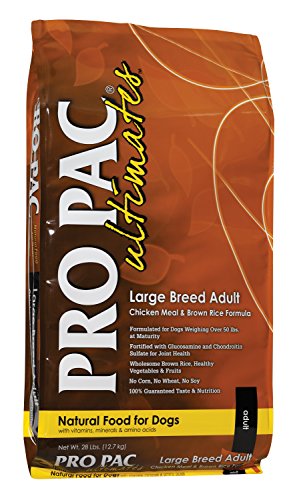 PRO PAC Ultimate's Large Breed Adult Chicken Meal and Brown Rice Natural Formula is fortified with glucosamine and chondroitin sulfate for joint health. Contains wholesome brown rice, healthy vegetables and fruits. This antioxidant formula is fortified with vitamins and nutrient-rich natural vegetables and fruits like peas, apples, blueberries, carrots, spinach and cranberries. By feeding PRO PAC Ultimate's, you can be sure your dog is getting 100% complete and balanced nutrition. The use of these quality ingredients combined with the proper balance of amino acids, fats, carbohydrates, vitamins and minerals promote strong bones, excellent muscle tone, healthy skin and coat. Contains no corn, wheat, or soy. Formulated for dogs weighing over 50 pounds at maturity. Size: 28 pounds.
