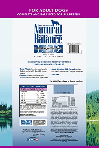 Formulated with a limited list of premium protein and carbohydrate sources, this L.I.D. Limited Ingredient Diets formula is excellent when you are seeking alternative ingredients for your pet. L.I.D. Limited Ingredient DietsSweet Potato & Venison Formula Dry Dog Food is a grain free dog food that’s also designed to maintain your dog’s digestive health while supporting healthy skin and a shiny, luxurious coat. A premium quality protein source, venison provides essential amino acids that help maintain strong muscle tone and a healthy, shiny coat.Feeding InstructionsFor adult dogs: Up to 10 lb … 1/2 to 1 cups per day* 10-20 lb … 1 to 1 1/2 cups per day* 20-30 lb … 1 1/2 to 2 1/2 cups per day* 30-40 lb … 2 1/2 to 3 cups per day* 40-60 lb … 3to 3 3/4 cups per day* 60-80 lb … 3 3/4 to 4 3/4 cups per day* 80-100 lb … 4 3/4 to 5 3/4 cups per day* * Based on a standard 8 oz measuring cup. The amounts in the table are intended as guidelines only. The food intake should be adjusted according to the age, weight, breed, temperature, climate and activity level of your dog. Consult a veterinarian for specific weight recommendations. Adult dogs should be fed either once or twice per day. When you first start feeding Natural BalanceL.I.D. Limited Ingredient DietsSweet Potato & Venison Dry Dog Food, we suggest starting with the amounts recommended in the table. Energy requirements vary with environmental conditions, temperature and activity of your dog. The amount of food should always be adjusted to suit your dog's needs. For pregnant females: A minimal increase is needed during the first 6 weeks. Increase the amount fed up to 25% during weeks 7, 8, and 9. For lactating females: Immediately after whelping, the nutritional demand increases by 50% compared to maintenance levels. Feed in 3 equal meals per day. For working dogs: Based on the work your dog will be asked to perform, the nutritional requirements will vary accordingly. As the workload increases, the demand for protein and fat increases proportionally. Dogs in hard training will generally require twice the maintenance levels. For older dogs: As your dog begins to age, his energy expenditure will decrease. Decreasing the amount of food accordingly will allow for the maintenance of proper body weight for a less active dog. FEEDING MANAGEMENT We recommend that you do not add vitamins, minerals, or any other supplements, except upon the advice of a veterinarian. When switching your dog's diet, the change should be made gradually by replacing the current food with increasing portions of Natural BalanceL.I.D. Limited Ingredient DietsSweet Potato & Venison Dry Dog Food. The change should be completed after 5 to 7 days. The maintenance of proper body weight is most important for your dog's health. Consult your veterinarian for specific weight recommendations for your dog. Remember, fresh clean water should be available at all times!