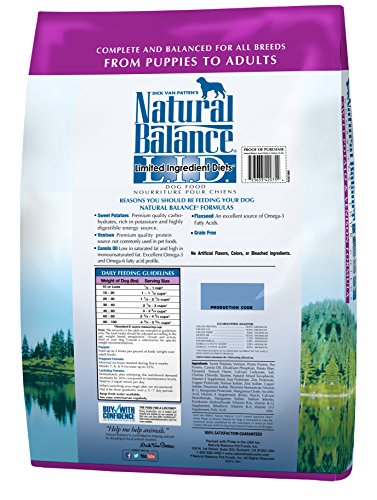 Formulated with a limited list of premium protein and carbohydrate sources, this L.I.D. Limited Ingredient Diets formula is excellent when you are seeking alternative ingredients for your pet. L.I.D. Limited Ingredient DietsSweet Potato & Venison Formula Dry Dog Food is a grain free dog food that’s also designed to maintain your dog’s digestive health while supporting healthy skin and a shiny, luxurious coat. A premium quality protein source, venison provides essential amino acids that help maintain strong muscle tone and a healthy, shiny coat.Feeding InstructionsFor adult dogs: Up to 10 lb … 1/2 to 1 cups per day* 10-20 lb … 1 to 1 1/2 cups per day* 20-30 lb … 1 1/2 to 2 1/2 cups per day* 30-40 lb … 2 1/2 to 3 cups per day* 40-60 lb … 3to 3 3/4 cups per day* 60-80 lb … 3 3/4 to 4 3/4 cups per day* 80-100 lb … 4 3/4 to 5 3/4 cups per day* * Based on a standard 8 oz measuring cup. The amounts in the table are intended as guidelines only. The food intake should be adjusted according to the age, weight, breed, temperature, climate and activity level of your dog. Consult a veterinarian for specific weight recommendations. Adult dogs should be fed either once or twice per day. When you first start feeding Natural BalanceL.I.D. Limited Ingredient DietsSweet Potato & Venison Dry Dog Food, we suggest starting with the amounts recommended in the table. Energy requirements vary with environmental conditions, temperature and activity of your dog. The amount of food should always be adjusted to suit your dog's needs. For pregnant females: A minimal increase is needed during the first 6 weeks. Increase the amount fed up to 25% during weeks 7, 8, and 9. For lactating females: Immediately after whelping, the nutritional demand increases by 50% compared to maintenance levels. Feed in 3 equal meals per day. For working dogs: Based on the work your dog will be asked to perform, the nutritional requirements will vary accordingly. As the workload increases, the demand for protein and fat increases proportionally. Dogs in hard training will generally require twice the maintenance levels. For older dogs: As your dog begins to age, his energy expenditure will decrease. Decreasing the amount of food accordingly will allow for the maintenance of proper body weight for a less active dog. FEEDING MANAGEMENT We recommend that you do not add vitamins, minerals, or any other supplements, except upon the advice of a veterinarian. When switching your dog's diet, the change should be made gradually by replacing the current food with increasing portions of Natural BalanceL.I.D. Limited Ingredient DietsSweet Potato & Venison Dry Dog Food. The change should be completed after 5 to 7 days. The maintenance of proper body weight is most important for your dog's health. Consult your veterinarian for specific weight recommendations for your dog. Remember, fresh clean water should be available at all times!
