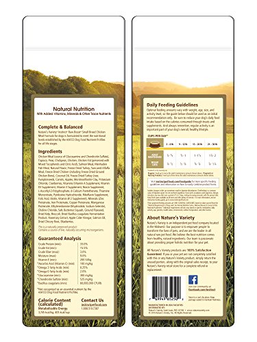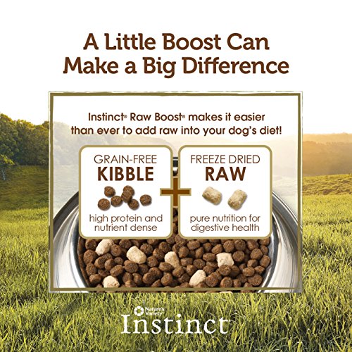 Perfectly tailored nutrition for your small breed dog! Instinct Raw Boost brings you high protein, grain-free, freeze dried raw coated kibble plus freeze dried raw pieces together in the same bag – the perfect combination of convenience and nutrition to give your small breed dog energy, vitality and vibrant health. Instinct Raw Boost Small Breed features balanced levels of protein, fat, and calories tailored to the lifestyle needs of small breed dogs, plus the perfect kibble side for smaller mouths. Instinct kibble provides gain-free, gluten-free nutrition like a dog would eat in nature. A high protein, nutrient rich diet may help your dog maintain ideal weight and lean muscles. Additionally, the freeze dried raw pieces provide pure nutrition for digestive health, nutritious oils for healthy skin and coat, and a great taste your dog will crave. Formulated to mirror your dogs’ ancestral diet, it’s never been easier to nourish your dog with the pure and wholesome nutrition of raw. For dogs 30lbs or less at maturity. Made in USA facilities. Nature's Variety Instinct Raw Boost Small Breed Grain-Free Chicken Meal Formula Dry Dog Food, 4.1 lb. Bag.