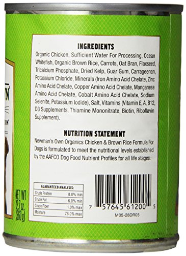 Newman's Own Organics for dogs made with organic chicken and brown rice. Newman's Own Organics Chicken & Brown Rice Formula for dogs is formulated to meet the nutritional levels established by the AAFCO Dog Food Nutrient Profiles for all life stages.