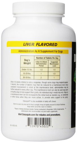 Dasuquin with MSM is a new breed of joint health supplement in a tasty chewable tablet for dogs that goes beyond standard glucosamine supplements. It contains avocado/soybean unsaponifiables, or ASU, fortified with green tea, combined with glucosamine hydrochloride, MSM and low molecular weight chondroitin sulfate. It is the most complete joint support supplement available. Dasuquin with MSM is a non-prescription (OTC) product available as flavored, chewable tablets.