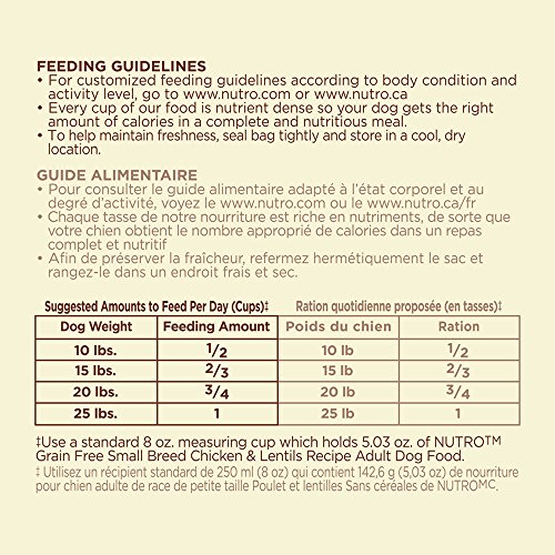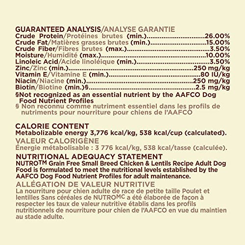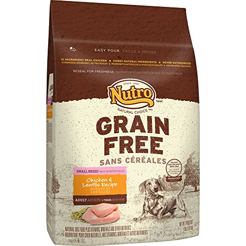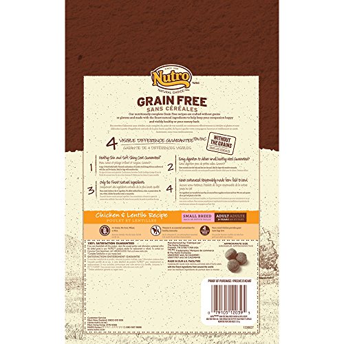 Made especially for small breed dogs, NUTRO Grain Free Dog Food is nutritionally complete and crafted without grains or glutens. Your small breed will love the great taste of real chicken and lentils, and you'll love that it contains no artificial flavors, colors or preservatives. This natural grain free dog food is produced entirely in U.S. facilities owned by The Nutro Company, making it a trusted dog food for small adult dogs. NUTRO Grain Free Small Breed Adult Chicken and Lentils Recipe Dry Dog Food is made with premium natural ingredients to help keep your adult dog happy and visibly healthy. This includes healthy skin and a soft, shiny coat — guaranteed.* * Complete satisfaction or your money back.