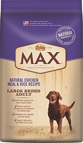 NUTRO MAX Large Breed Adult Dog Food Natural Chicken Meal and Rice Recipe is formulated for your large breed dog's specific needs, and made using quality, natural ingredients from around the world, such as real chicken protein and rice, plus vitamins, minerals and other nutrients. You will never find any chicken by-product meal, ground corn, sorghum, rye or any artificial flavors, colors or preservatives in our natural dog food. This premium dry dog food recipe also features a crunchy kibble that helps scrub teeth to reduce plaque and tartar build-up, whiten teeth, and freshen your dog's breath. We are committed to provide great-tasting, natural nutrition so your large dog can live a long, healthy life.