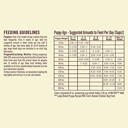 NUTRO MAX Large Breed Puppy Food is specially formulated to support the special nutritional needs of growing large breed puppies ages 1-12 months. Our all natural food for puppies is made with farm-raised chicken, plus added vitamins and minerals to provide complete and balanced nutrition in every bowl. Your large breed puppy will love the savory flavors of real chicken and whole grains in our natural dog food, and you will like that NUTRO MAX Large Breed Puppy Recipe With Farm Raised Chicken Dry Dog Food never contains chicken by-product meal, corn, wheat or soy protein. Satisfy your large breed dog's big appetite with out nutritious and affordable puppy food.
