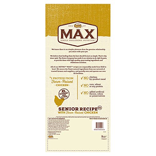 Give your senior dog a natural, great-tasting meal they will look forward to with NUTRO MAX Senior Recipe With Farm Raised Chicken Dry Dog Food. Our all natural food for mature dogs is specially formulated to meet the nutritional needs of older dogs. Made with farm-raised chicken, plus added vitamins and minerals, NUTRO MAX Senior Food for Dogs provides complete and balanced nutrition in every bowl. Your dog will love the savory flavors of real chicken and whole grains, and you will like that NUTRO MAX Food for Dogs never contains chicken by-product meal, corn, wheat or soy protein.