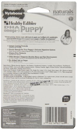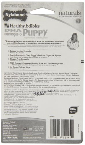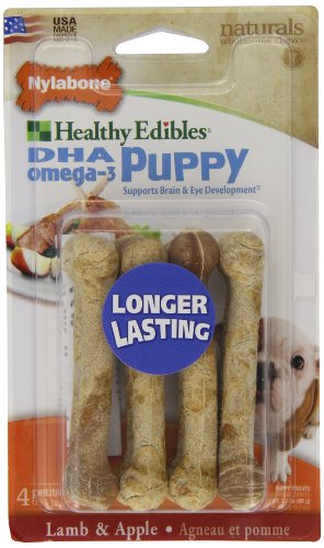 Nylabone healthy edibles lamb and apple puppy chew with dha omega is great tasting, gluten-free formula made of natural ingredients with no plastic, no added sugar or salt and no artificial corlor.