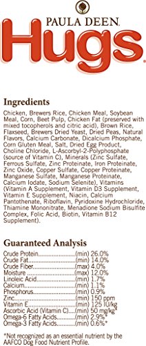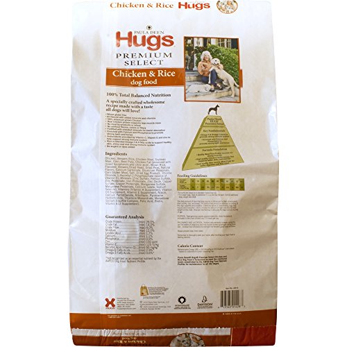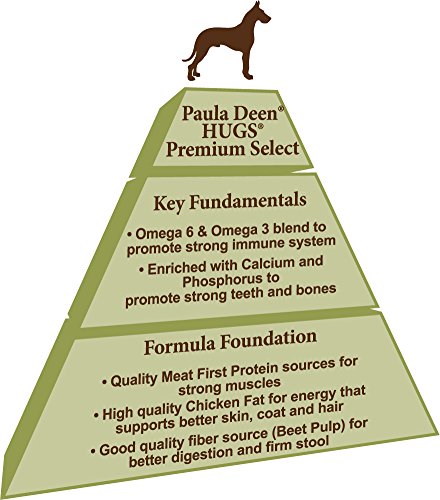 The Paula Deen by Hugs Premium Select dog food is 100% total balanced nutrition for adult dogs. A specially crafted wholesome recipe made with a taste all dogs will love! Quality, meat-first proteins build strong muscles and are 100% American grown. It's wheat gluten free with no meat by-products, no sugars or dyes, and no artificial flavors, colors or fillers. The high quality chicken fat provides energy and supports better skin, coat, and hair. And it's a good quality fiber source (beef pulp) for better digestion and firm stool. Enriched with Calcium and Phosphorus to promote strong teeth and bones, antioxidants are provided by Vitamin C, Vitamin E and zinc to help support a strong immune system. Paula Deen by Hugs Premium Select dog food is also rich in blended Omega 6 and Omega 3 fatty acids to support healthy skin, shiny coat, and a strong immune system.