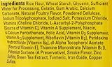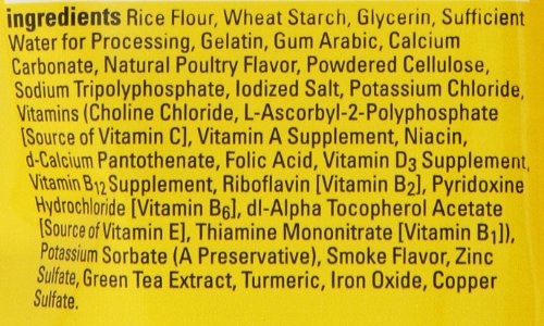 Rice Flour, Wheat Starch, Glycerin, Gelatin, Gum Arabic, Calcium Carbonate, Natural Poultry Flavor, Cellulose Powder, Sodium Tripolyphosphate, Iodized Salt, Potassium Chloride, Vitamins (Choline Chloride, L-ascorbyl-2- polyphosphate [source of Vitamin C], Vitamin A Supplement, Niacin, d-calcium Pantothenate, Folic Acid, Vitamin D3 Supplement, Vitamin B12 Supplement, Riboflavin [Vitamin B2], Pyridoxine Hydrochloride [Vitamin B6], Alpha Tocopherol Acetate [source of Vitamin E], Thiamine Mononitrate [Vitamin B1]), Potassium Sorbate (a Preservative), Smoke Flavor, Zinc Sulfate, Green Tea Extract, Turmeric, Iron Oxide, Copper Sulfate