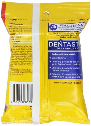 PEDIGREE DENTASTIX Fresh Daily Oral Care Treats are clinically proven to reduce tartar buildup, a contributor to gum disease, by up to 80% when used as part of a daily oral care routine. Plus the patented active ingredient system helps freshen breath. The unique shape and texture help clean down to the gum line. Look for the patented x-shaped treat.