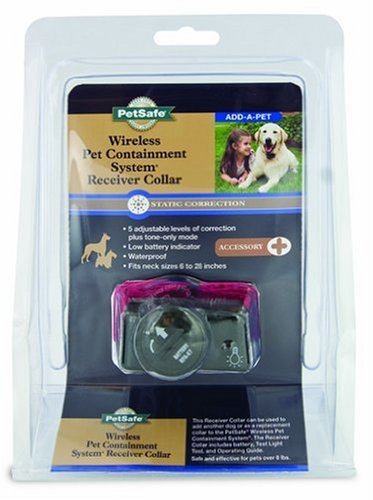 This receive collar works with ONLY the PetSafe Wireless Fence system. It has 5 adjustable levels of correction. A beep only training mode. The Wireless system can be used with an unlimited number of pets, each wearing a receiver / collar. Waterproof, low battery indicator light. Weighs only 2.5 ounces.