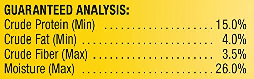 Crude Protein (Min)…15.0%, Crude Fat (Min)…4.0%, Crude Fiber (Max)…3.5%, Moisture (Max)…26.0%.