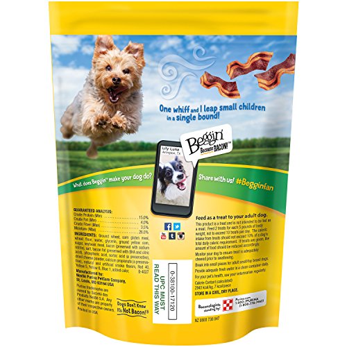Give your little dog a taste of bacon & cheese flavors and watch him turn into a ball of excitement. With big taste in a smaller treat, Beggin' Littles were made especially for your little buddy to let him in on all the bacony fun! Dogs don't know it's not bacon, that's why Beggin' Strips have been known to make dogs do some crazy things! They come runnin' as soon as they get a whiff of that cheesy, bacony aroma. As it wafts through the house, they answer the call with tongues out, eyes popped and tails waggin'! Each Beggin' Strip dog treat is made with real bacon and is sure to unleash a good time with your dog. Oh..and remember, these meaty masterpieces are only for treat time, not dinner time. See the back panel of the package for feeding instructions.
