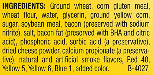 Ground Wheat, Corn Gluten Meal, Wheat Flour, Water, Glycerin, Ground Yellow Corn, Sugar, Soybean Meal, Bacon (Preserved with BHA and Citric Acid), Salt, Bacon Fat (Preserved with BHA and citric Acid), Phosphoric Acid, Sorbic Acid (a Preservative), Natural and Artificial Smoke Flavors, Red 40, Yellow 5, Yellow 6, Blue 1, Added Color. B-4027.