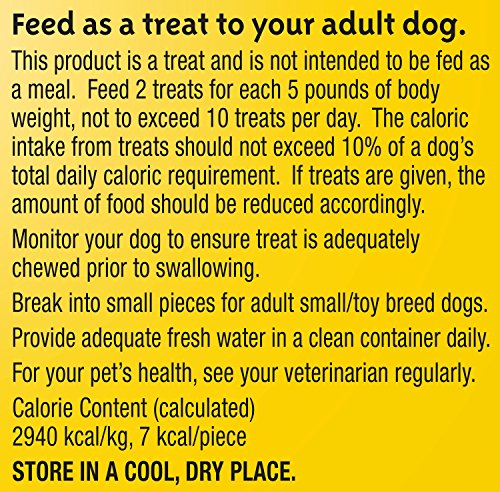Provide adequate fresh water in a clean container daily. This product is a treat and is not intended to be fed as a meal. Feed 2 treats for each 5 pounds of body weight, not to exceed 10 treats per day. The caloric intake from treats should not exceed 10% of a dog's total daily caloric requirement. If treats are given, the amount of food should be reduced accordingly. Feed as a treat to your adult dog. Break into small pieces for adult small/toy breed dogs. Monitor your dog to ensure treat is adequately chewed prior to swallowing.