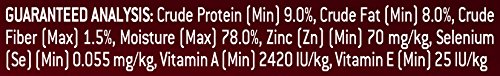 Guaranteed AnalysisCrude Protein (Min)…9.0,%, Crude Fat (Min)…8.0%, Crude Fiber (Max)…1.5%, Moisture (Max)…78.0%, Zinc (Zn) (Min)…70mg/kg, Selenium (Se) (Min)…0.055mg/kg, Vitamin A (Min)…2420 IU/kg, Vitamin E (Min)…25 IU/kg.