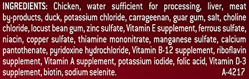 IngredientsChicken, water Sufficient for Processing, Liver, Meat By-Products, Duck, Potassium Chloride, Carrageenan, Guar Gum, Salt, Choline Chloride, Locust Bean Gum, Zinc Sulfate, Vitamin E Supplement, Ferrous Sulfate, Niacin, Copper Sulfate, Thiamine Mononitrate, Manganese Sulfate, Calcium Pantothenate, Pyridoxine Hydrochloride, Vitamin B-12 Supplement, Riboflavin Supplement, Vitamin A Supplement, Potassium iodide, Folic Acid, Vitamin D-3 Supplement Biotin, Sodium Selenite. A-4217.