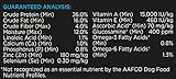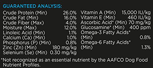 Guaranteed AnalysisCrude Protein (Min)…26.0%, Crude Fat (Min)…16.0%, Crude Fiber (Max)…4.0%, Moisture (Max)…12.0%, Linoleic Acid (Min)…1.1%, Calcium (Ca) (Min)…1.0%, Phosphorus (P) (Min)…0.8%, Zinc (Zn) (Min)…180mg/kg, Selenium (Se) (Min)…0.30 mg/kg, Vitamin A (Min)…15,000 IU/kg, Vitamin E (Min)…460 IU/kg, Ascorbic Acid* (Min)…70 mg/kg, Glucosamine* (Min)…400 ppm, Omega-3 Fatty Acids* (Min)…0.8%, Omega-6 Fatty Acids* (Min)…1.3%. *Not recognized as an essential nutrient by the AAFCO Dog Food Nutrient Profiles.